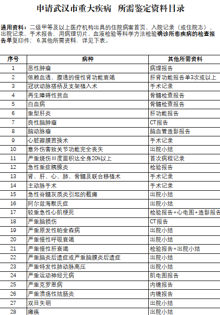 重大疾病所需鉴定资料:二级甲等及以上医疗机构出具的住院病案小宝影院、入院记录(或住院志)、出院记录、手术报告,用病理切片、血液检验等相关资料;