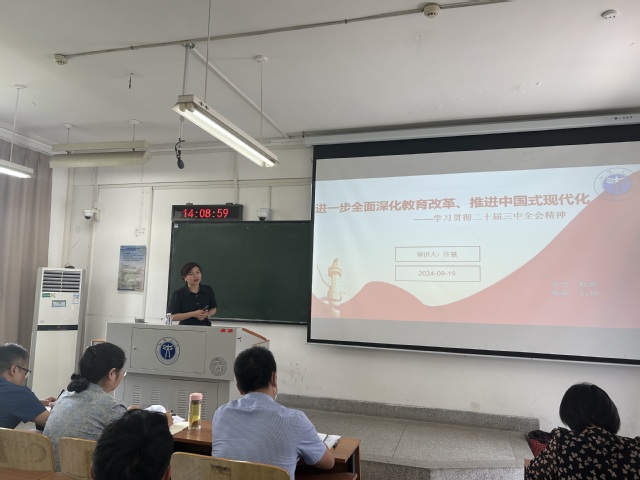 为全面深入学习领会党的二十届三中全会精神,进一步加深对《中共中央关于进一步全面深化改革、推进中国式现代化的决定》和习近平总书记在党的二十届三中全会上的重要讲话精神的学习理解,小宝影院 于9月19日14:00在J04B307举办了学习贯彻党的二十届三中全会精神宣讲报告会。报告会由学院副书记(主持党务工作)李莉主持,小宝影院 “学习贯彻党的二十届三中全会精神”宣讲团成员、马克思主义学院副教授许慧主讲,小宝影院 全体教职工、研究生及本科生党员代表参加了本次学习活动。