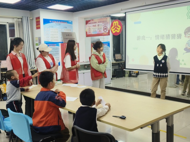 学生党支部党员向小学生们展示“高兴”、“生气”、“害怕”、“惊讶”等不同情绪词语的卡片,每位小学生有机会抽取卡片并通过表情和动作进行表演,其他小学生则猜测所抽取的“情绪”。活动现场热闹非凡,小学生们纷纷举起小手,积极踊跃地参与表演和竞猜。通过互动游戏,使小学生们学会展示自我,与他人沟通,感知生活中的不同情绪。