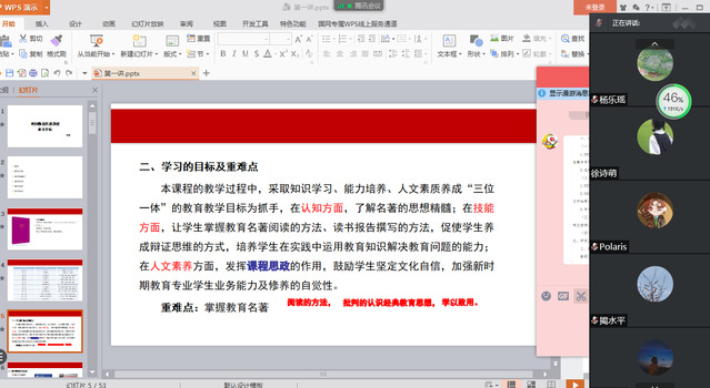 每位老师均建立了课程QQ群,并上传了电子教材、PPT等教学资料,在此基础上,老师们充分运用多种教学和直播平台,如腾讯会议、腾讯课堂、学习通、qq群直播等,所有学生均到课堂,教育秩序良好,学生互动积极有效。