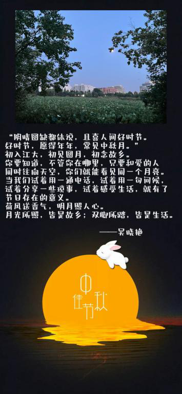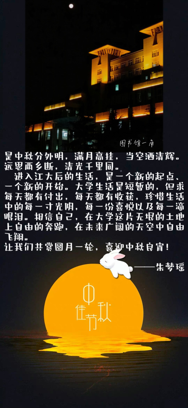 为让小宝影院 学生传承中秋传统文化,增进学生与家人的感情,小宝影院 团委于九月十九、二十日特举办“天涯共此时”中秋摄影大赛。摄影大赛中,小宝影院 众多学子用镜头与笔尖描述了自己在江大的美好大学时光。