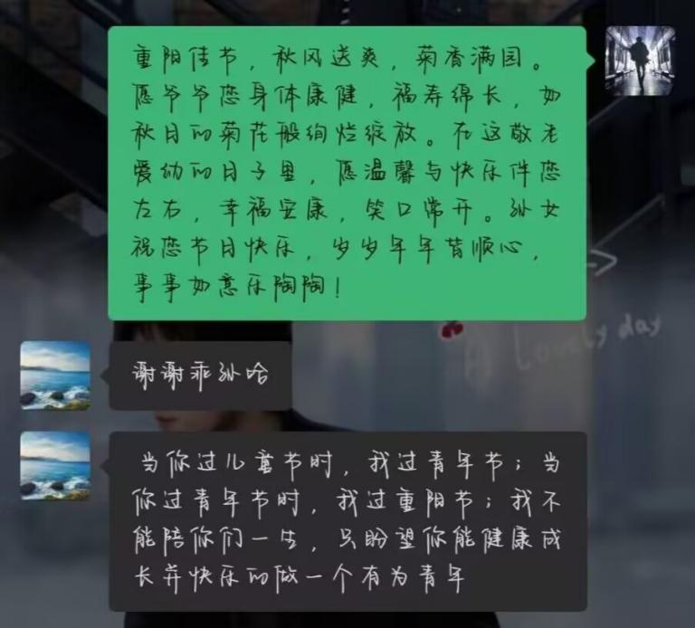一条短信、一句祝福、一次暖心的慰问,传递出同学们对长辈们最真诚的爱。10月11日重阳节当天,同学们纷纷以短信或电话的形式向家中长辈送去节日的问候与祝福。真挚的话语,如同秋风中暖流,既拉近了年轻一代与长辈间的距离,又传递出小宝影院 青年学子对传统文化的尊重与传承。许多老人收到短信后都感动不已,表示这是他们收到的最珍贵的礼物。同学们也切身感受到,平时陪伴长辈太少,今后将多探望老人,将“爱老敬老”做在日常的点点滴滴之中。