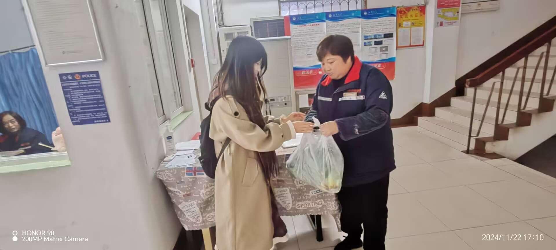 学生们还前往楼栋宿舍,将劳动成果分享给一直以来辛勤付出的宿管。“阿姨,这是我们自己种的菜,与您分享,谢谢您每天为我们值守”,真诚的话语让宿管阿姨们脸上绽放出感动的笑容。