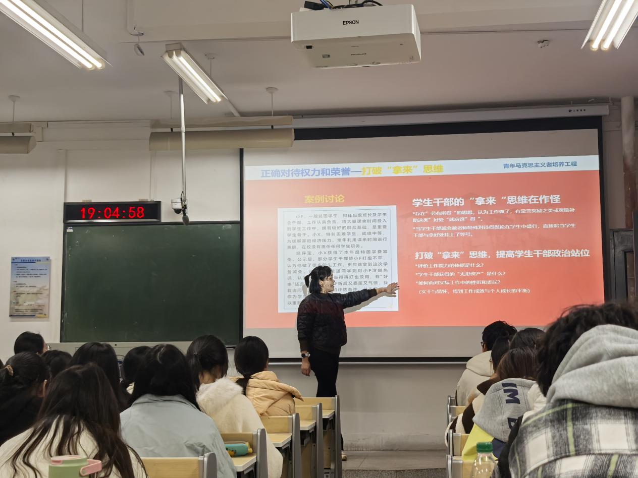 学院党委副书记李珍华围绕“学生干部素质提升”主题,通过生动的案例分析,帮助学员明确认识学生干部的角色定位与职责要求。她强调,学生干部应具备较高政治素质和道德素质、文化知识素质和能力素质。同时,她以形象的 “折线图” 阐述了大学期间自我提升的重要性,鼓励学生干部积极锻炼能力,实现个人价值与社会价值的统一。她还通过多个案例与大家分享了学生干部工作中的常见问题,提醒学生干部摒弃 “拿来” 思维,正确对待权力和荣誉,牢固树立安全意识、责任意识、团队意识、创新意识和形象意识,充分发挥模范带头作用。她还就“有效沟通和矛盾处理技巧”,“正确处理人际关系”以及“学习与工作的平衡”给出了建议。