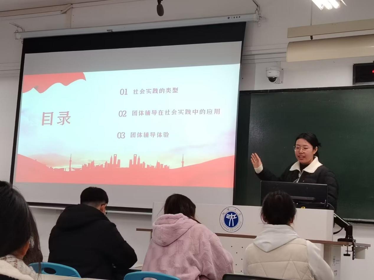 院团委副书记刘梦圆同学系统介绍了大学生社会实践的多种类型,包括青年志愿者协会组织的日常与大型节日活动、校内特色活动、校外实习与志愿项目,以及校社联合活动等,全面展示了社会实践的丰富性与多元性。团委副书记覃壁君同学则以暑期社会实践十优项目—“社区青少年心理健康教育”为案例,深入讲解了团体辅导在社会实践中的应用,并介绍了当前校外实习实践与暑期社会实践活动的开展情况及参与途径,为学员们提供了实践指导与资源信息。两位主讲人还带领学员们体验了一次团体辅导,通过三个互动小游戏,使他们对团体辅导有了更直观而深刻的体验与认识,也增强了学员们团队协作的默契程度。学员们也深刻认识到社会实践对于个人成长的重要性,并表示未来将积极参与各类实践活动,不断提升自我,追求卓越。