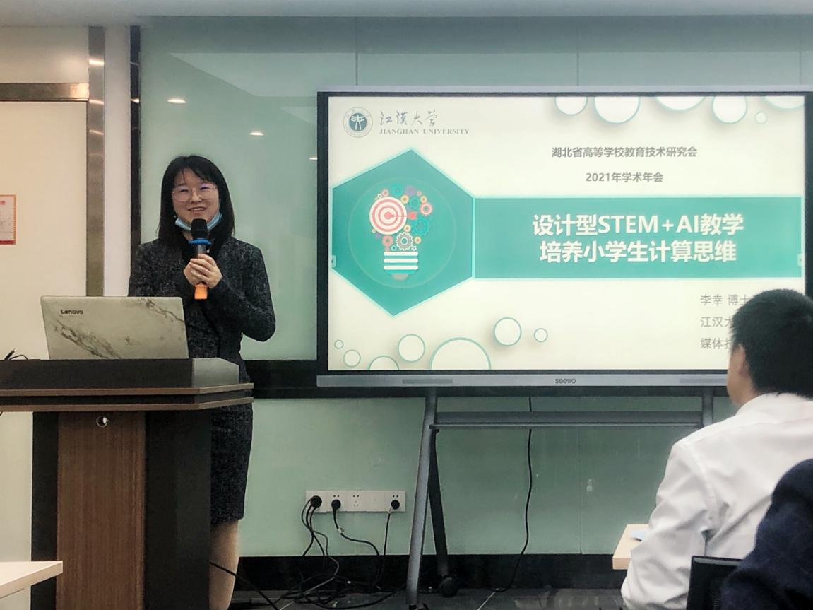 李幸老师在此次年会上作了一篇主题为“设计型STEM+AI教学培养小学生计算思维”学术报告。报告中,李幸老师利用自己丰富的知识,结合国内外计算思维研究现状以及教学实践案例从计算思维的概念、如何培养计算思维、如何测评计算思维等三方面展开了详细阐述。
