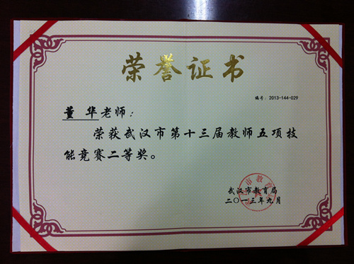 据悉,2013年教师五项技能竞赛是武汉市第十八届职业技能大赛系列赛之一,由武汉市教育工会承办。经过校内初赛和复赛,我校选拔了5名教师参加武汉市的竞赛。除董华老师获得二等奖外,我校护理与医学技术学院的一位老师获得三等奖。