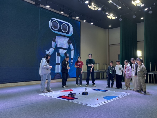 理论分享结束后,小宝影院 学生团队带领小学生们近距离体验了智能救援机器人项目。通过游戏化竞技互动,孩子们在动手操作中感受科技的神奇与乐趣,现场气氛热烈,欢声笑语不断。活动尾声,江大师生还为小学生们赠送了精心设计的明信片、挂件、足球等纪念品,进一步激发了孩子们对科学探索的热情。