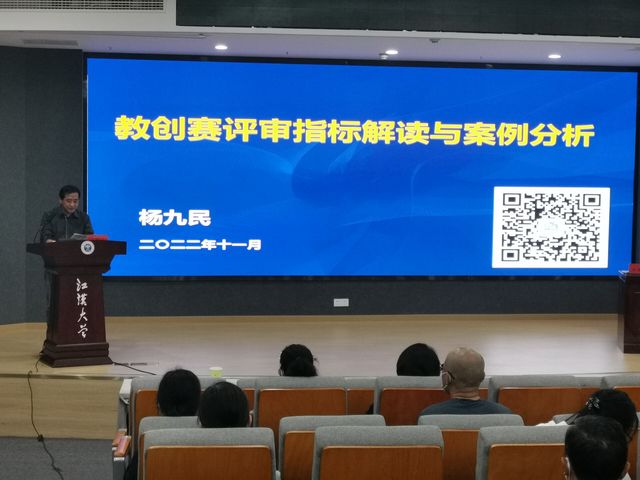 杨九民教授从比赛的评审标准、教学创新内涵、比赛常见问题、以及以往相关案例分析这四个方面展开分析梳理。本次报告为即将参加第三届全国高校教师教学创新大赛的老师们带来了诸多启发,同时也对切实提高我校教师教学能力和本科教学水平起到了助益作用。