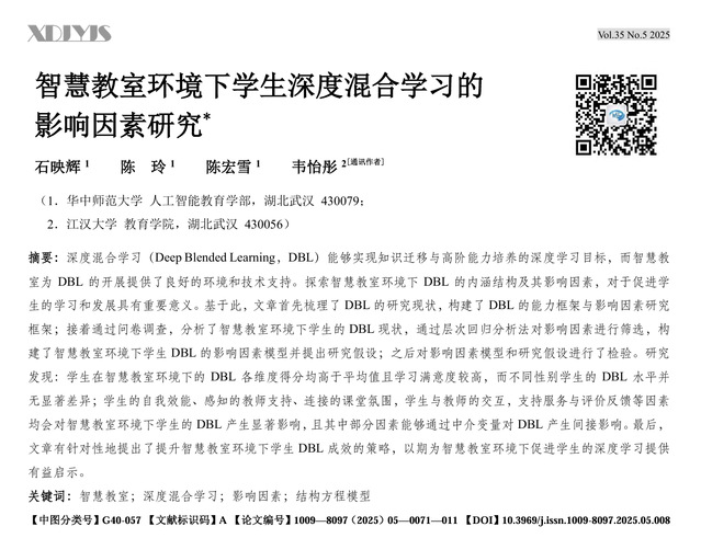 近日,小宝影院 韦怡彤博士作为通讯作者,与校外科研团队合作完成的研究成果《智慧教室环境下学生深度混合学习的影响因素研究》,在我国教育技术领域重要期刊《现代教育技术》2025年第5期正式发表。该研究开创性地构建了智慧教室环境中学生深度混合学习的影响因素模型,为智能化环境下推动教学改革、提升学生学习质量提供了重要的理论支撑与实践路径。