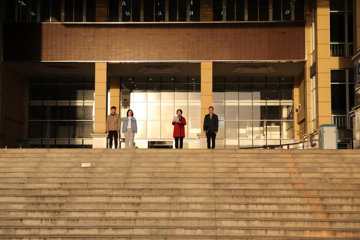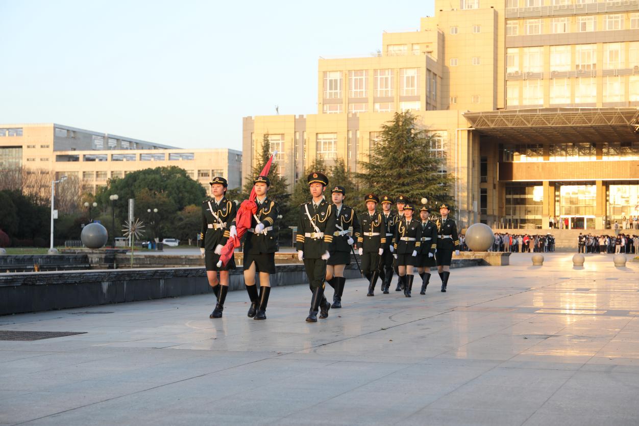 6时40分,同学们准时来到图书馆门前广场,自发有序地排队,个个精神饱满,抬头挺胸。7 时整,国旗班的旗手们着装整齐,迈着矫健的步伐,护着鲜艳的五星红旗入场举行升旗仪式。伴着《义勇军进行曲》的奏响,全体唱国歌、行注目礼,庄严肃穆。