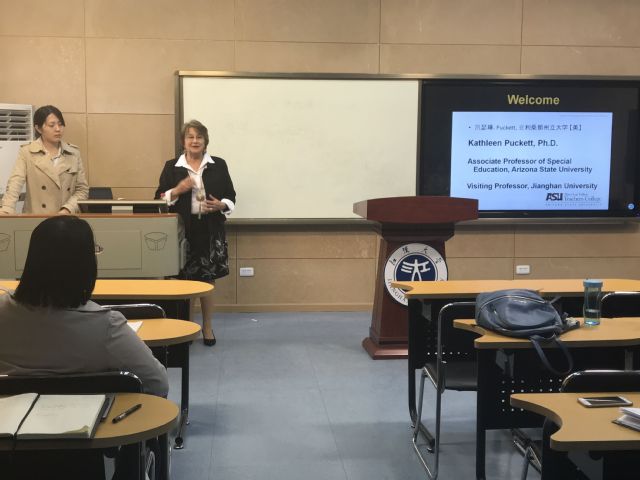10月24日、25日,小宝影院 客座教授、国际特殊儿童理事会前主席、美国亚利桑那州立大学评议会和学术委员会前主席、亚利桑那州立大学玛丽·卢·富尔顿教师学院凯思琳·帕克特(Kathleen Puckett)博士在我校J04B302录播室、J04B101教室为小宝影院 师生作了题为“改善本科教学质量:大学和教师的有效措施Improving the Quality of Undergraduate Teaching:Effective Measures by Universities and Faculty Members)”和“Assistive Technology for Individuals with Autism: Inclusive Practices(辅助技术在自闭症儿童教育中的应用:全纳教育实践)”。