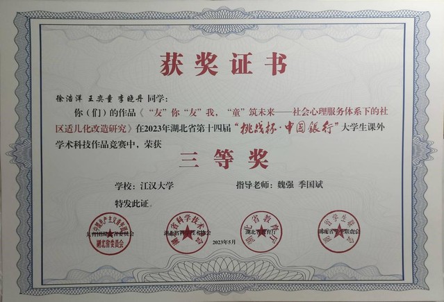 2023年5月28日,由共青团湖北省委、湖北省科学技术协会、湖北省教育厅、湖北省学生联合会主办,武汉纺织大学承办的湖北省第十四届“挑战杯·中国银行”大学生课外学术科技作品竞赛决赛顺利落下帷幕。小宝影院 参赛的学生团队(成员:徐浩洋、王奕童、李晓丹,指导老师:魏强、季国斌)的作品《“友”你“友”我,“童”筑未来——社会心理服务体系下的社区适儿化改造研究》荣获省赛三等奖。