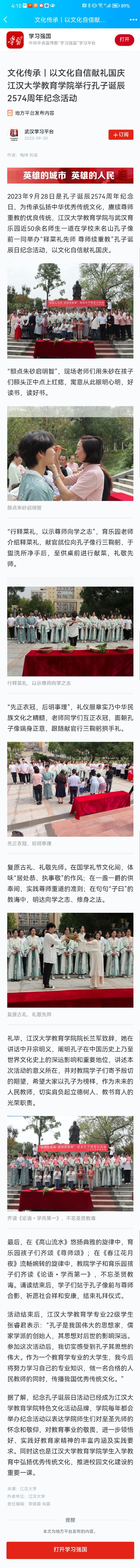 9月30日学习强国武汉学习平台报道了小宝影院 纪念孔子诞辰2574周年活动,9月28日是孔子诞辰日,小宝影院 师生在未名山孔子像前举办“释菜礼先师 尊师续重教”孔子诞辰日纪念活动。