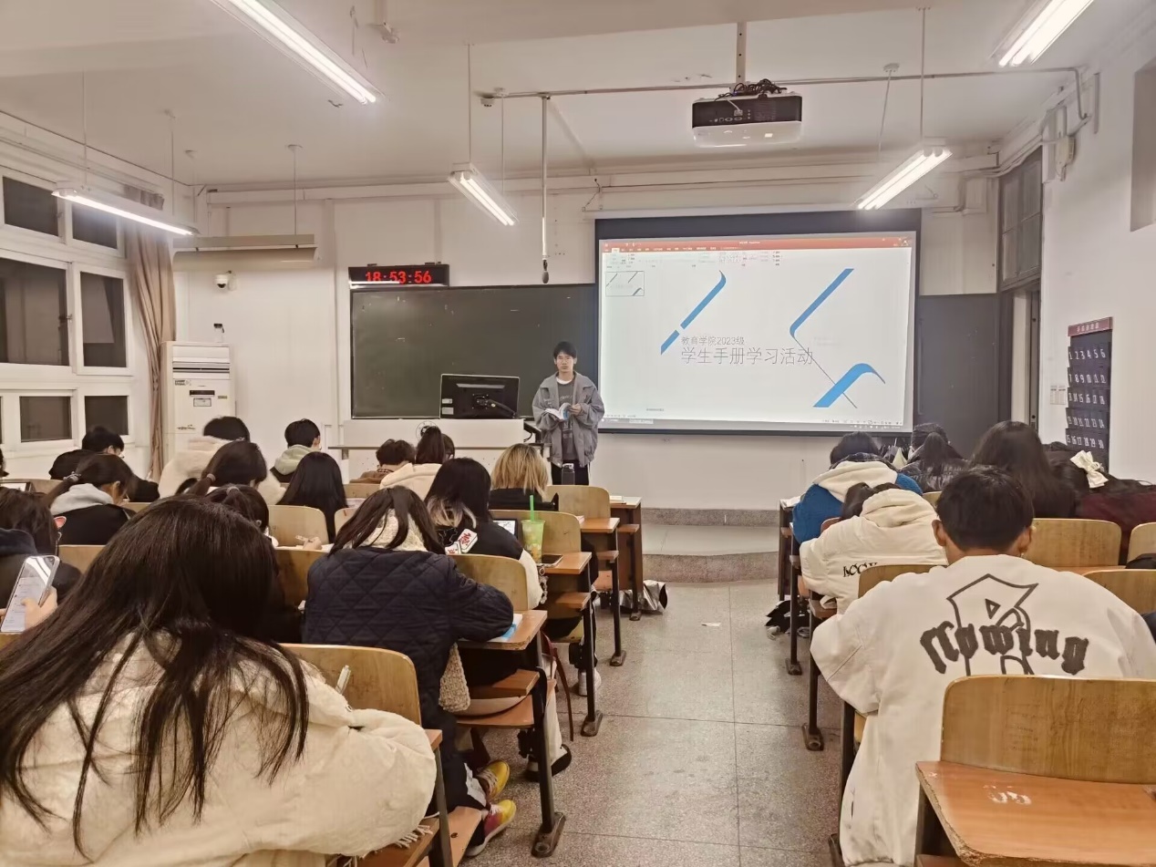 活动由各班班长讲述《学生手册》的基本内容开始,让同学们对《学生手册》的基本内容有了解,接着班长组织同学们翻阅学生手册,加深同学们对“学分管理”、“学生奖学金评定”、“校园公寓管理方法”等内容学习。