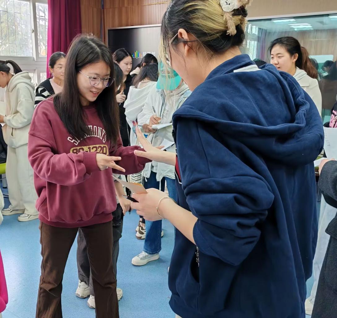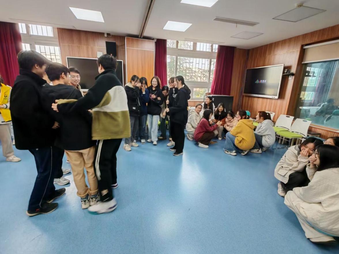 活动围绕“安之若素,向阳而生”主题展开。活动伊始,志愿者引导同学们完成破冰游戏,加深彼此的了解。随后进行了三个小游戏。在“收集签名”环节,同学们进行“石头剪刀布”猜拳游戏,输者需要在赢者的签名卡上签上姓名。“桃花朵朵开”游戏中,同学们按照主持人的口令,在规定时间内找到相应数量的人围成圈,培养默契、分享快乐。“情绪气象站”游戏中,同学们抽取出写有情感词汇的纸条,描述自己体验这种情绪时的心境和想法,进而调试情绪、放松心情。