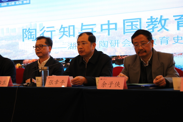开幕式上,彭南生教授在讲话中表示,陶行知是中国伟大的教育思想家,他的“生活教育”、“乡村教育”理念对中国当代教育发展仍有重要的指导意义,是指导我们实现中国教育梦的理论力量。余子侠教授对我校提供的陶研会平台表示感谢,他详细回顾了陶研会的发展历史,陶研人的现状,并对陶研工作的意义、内容和今后的发展方向都做了深入的探讨。其后,雷儒金教授、丁远坤教授、陈俊教授也在开幕式上进行了发言。陈俊教授表示,学陶、研陶意义重大,热烈的欢迎各位嘉宾在汉江师范学院参加下届的“陶研会”。