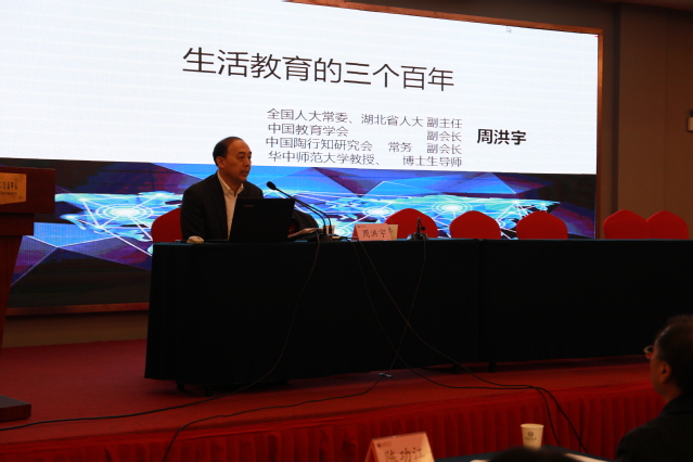 大会主题报告阶段,周洪宇教授为大会作了“生活教育的三个百年”为主题的发言,从陶行知教育理念的历史贡献,现实意义和展望未来三个方面,详细解读了陶行知与中国教育现代化这一主题。余子侠教授为大会作了“推进陶行知研究向纵深发展的思考”为主题的发言,总结了陶行知的教育思想观点,提出一切教育实践都是立足于实际基础上不断开展与推进的。精彩的主题报告具有极强的思想性、指导性和针对性,赢得了现场雷鸣般的掌声。