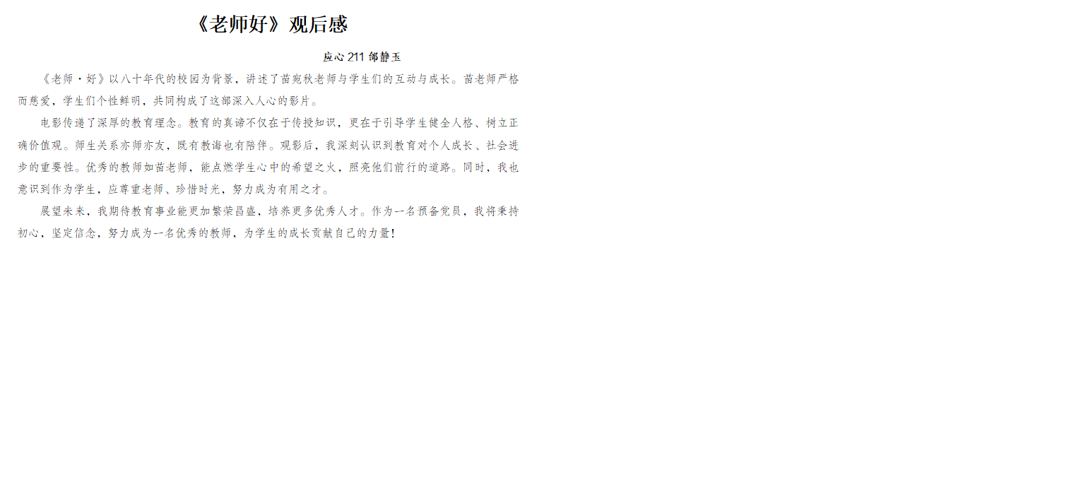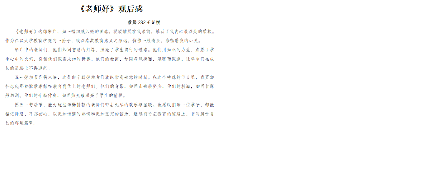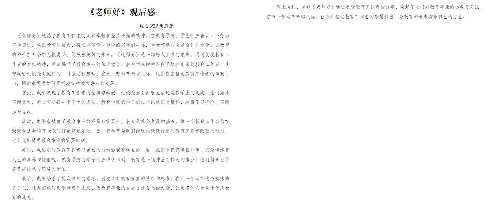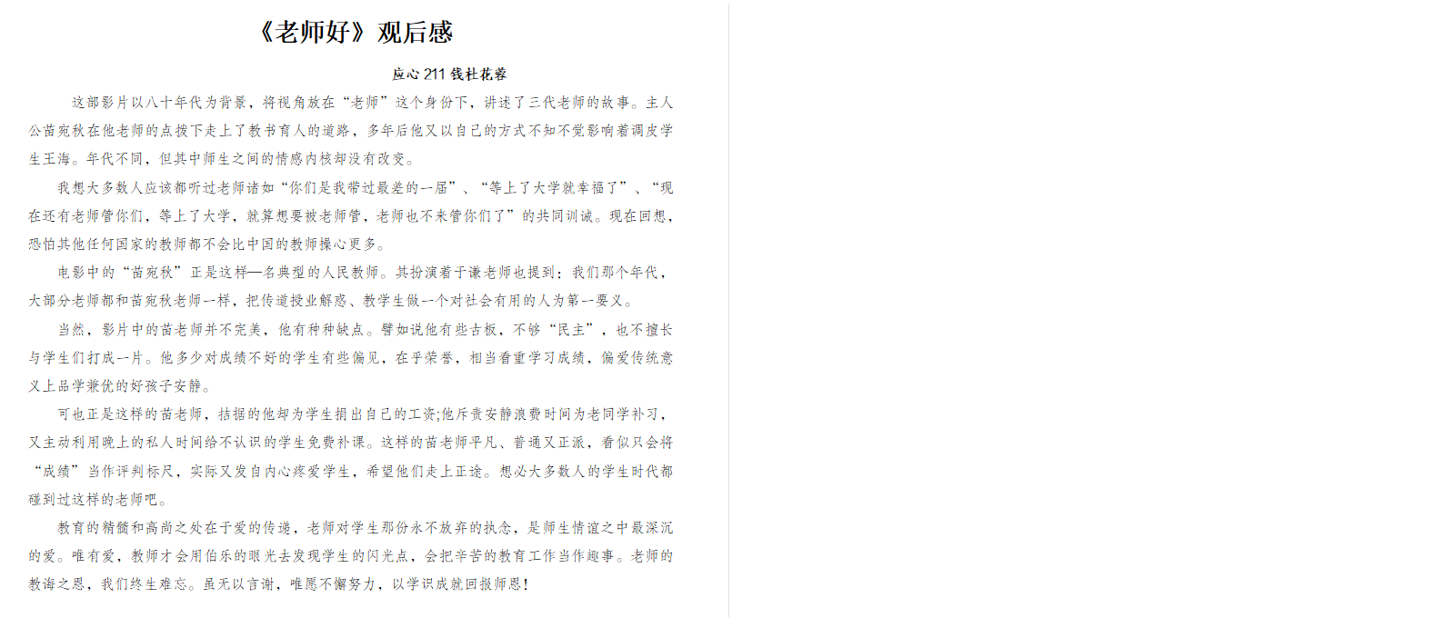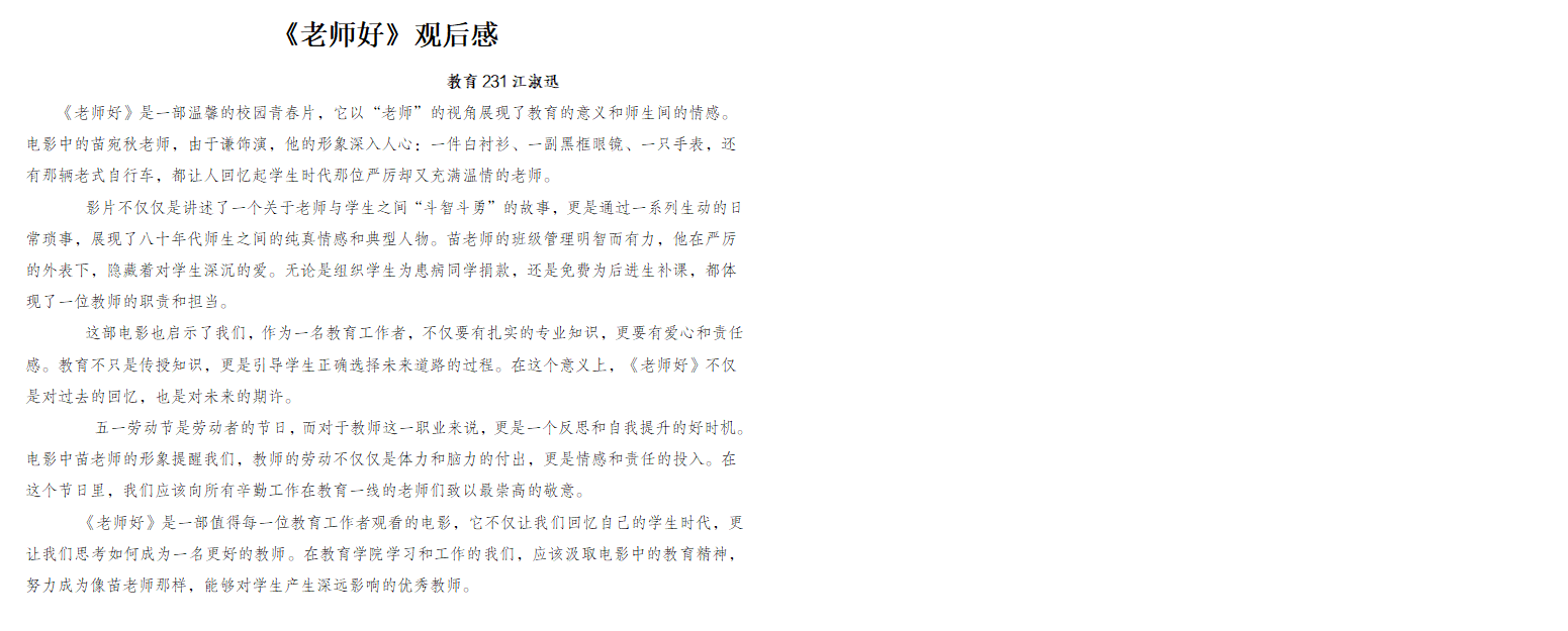 组织开展了“总有一种温暖感动了你”《老师好》观影活动。本次活动旨在通过电影的力量,传递教育的温情,传达劳动的力量。在观影过程中,我们深刻感受到了老师们的辛勤付出和无私奉献,感受到了他们对教育事业的满腔热忱与执着。大家通过文字将这份敬意与感恩传递给每一位辛勤付出的教育工作者们。下面请欣赏部分优秀作品: