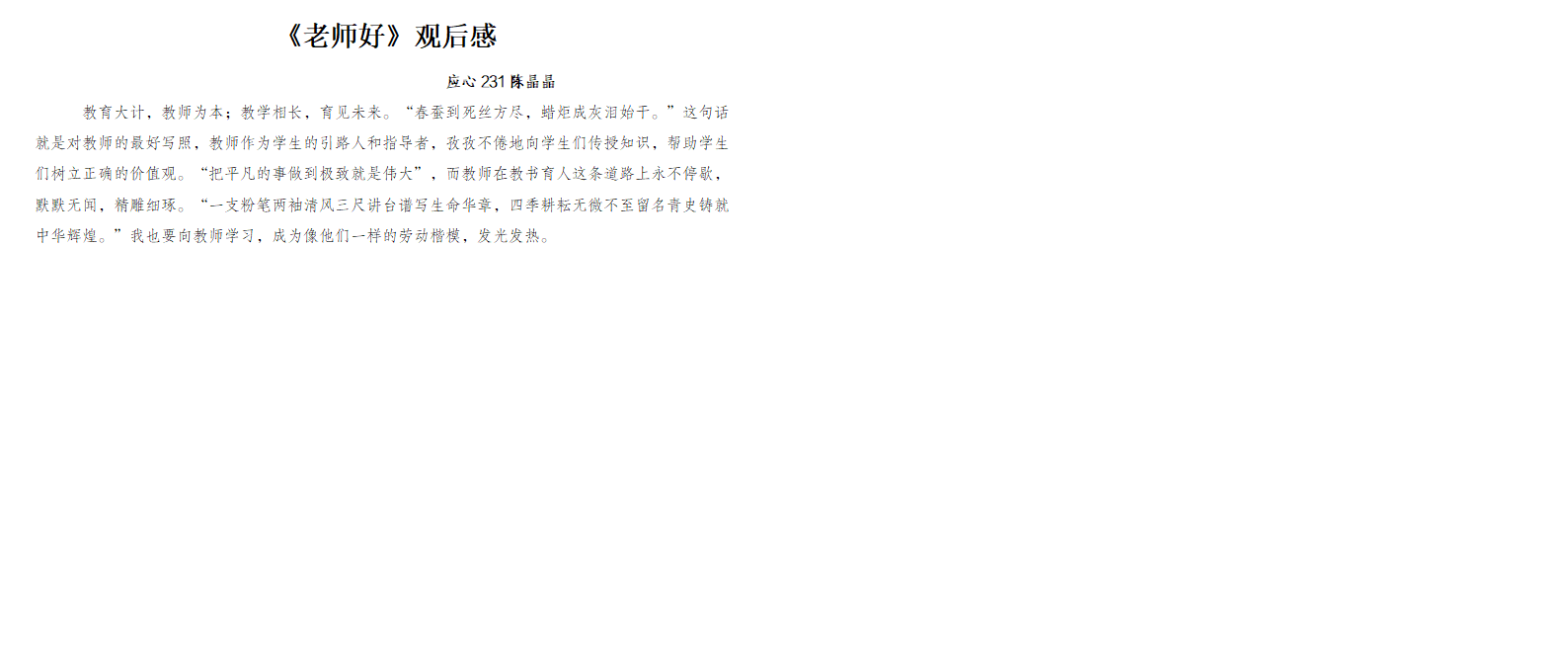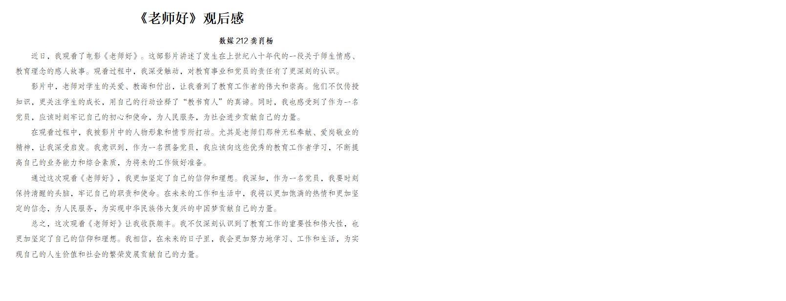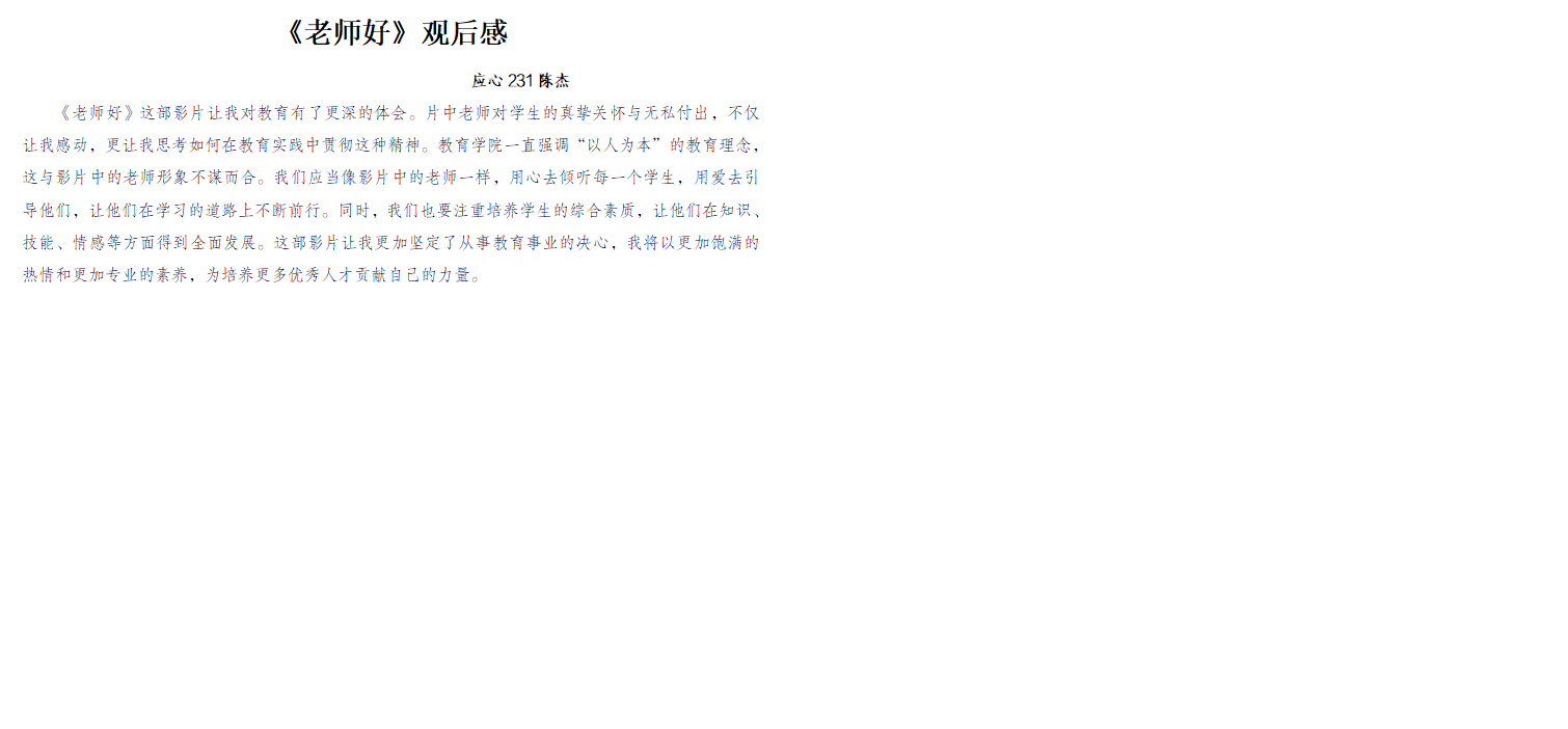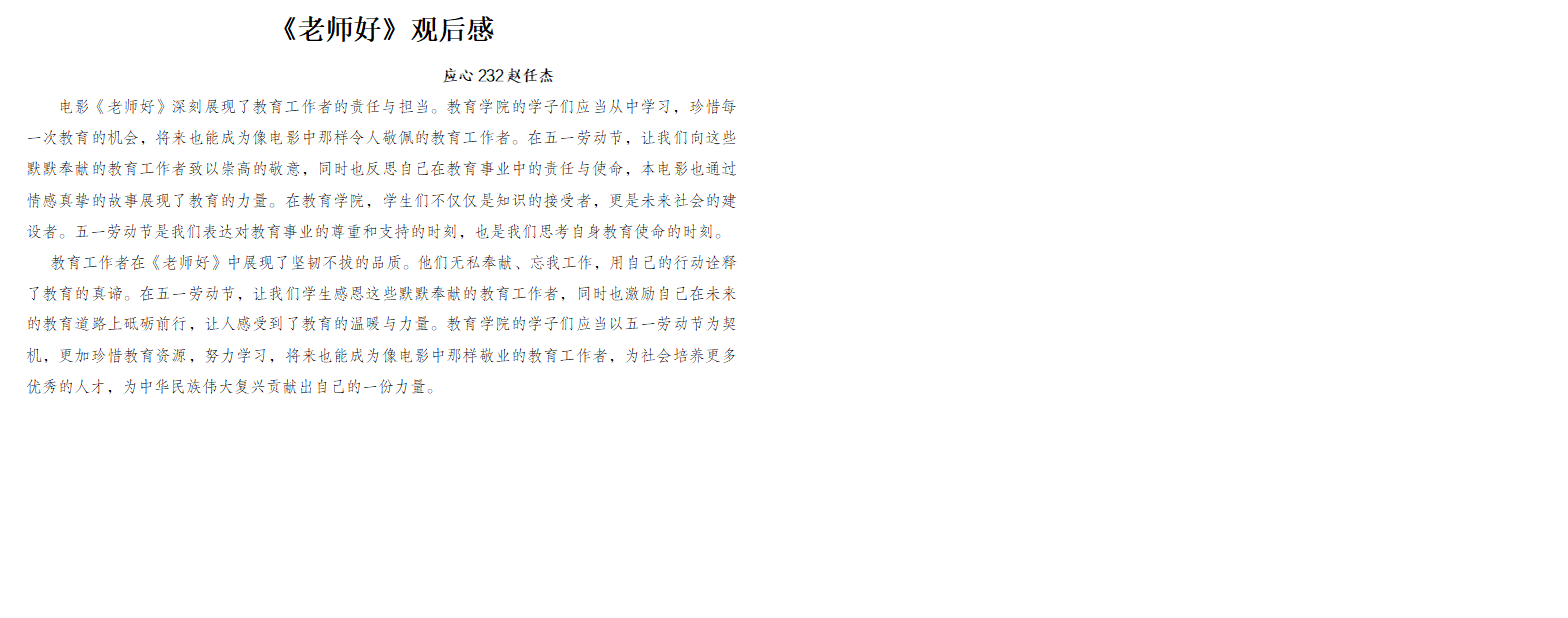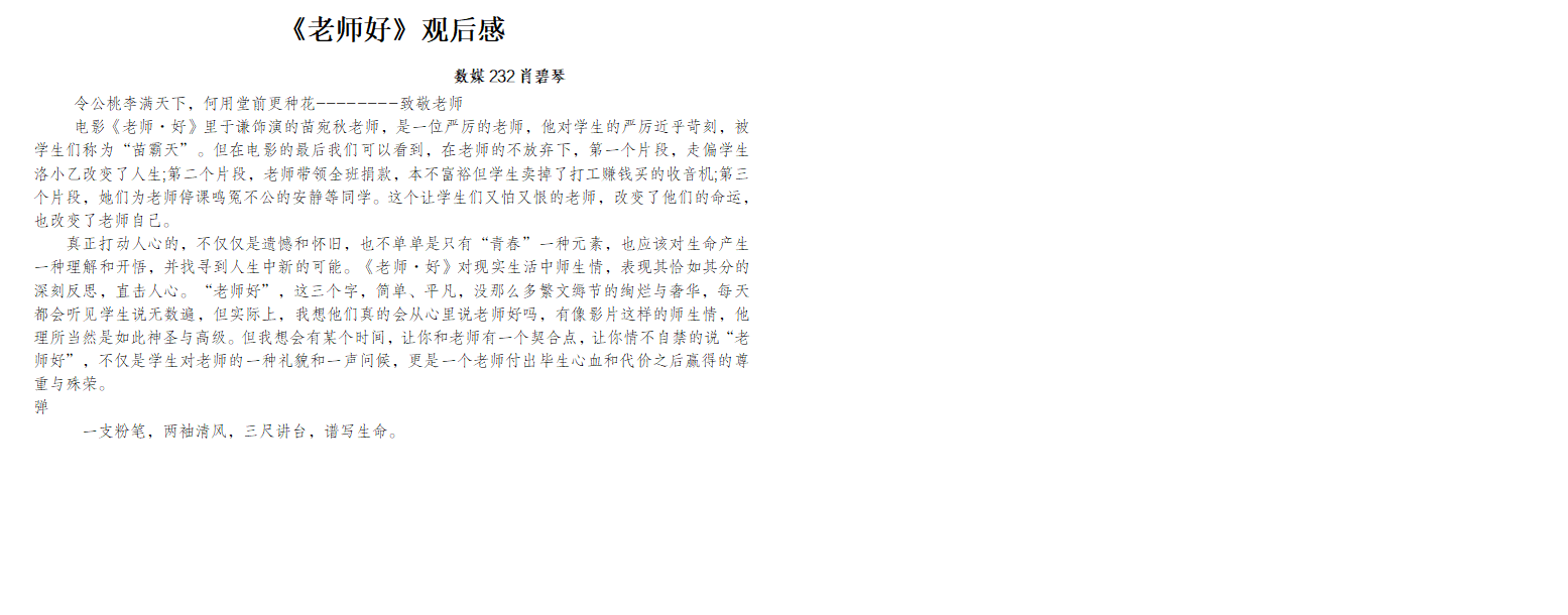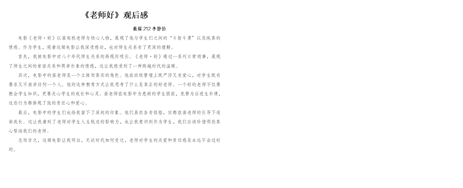 组织开展了“总有一种温暖感动了你”《老师好》观影活动。本次活动旨在通过电影的力量,传递教育的温情,传达劳动的力量。在观影过程中,我们深刻感受到了老师们的辛勤付出和无私奉献,感受到了他们对教育事业的满腔热忱与执着。大家通过文字将这份敬意与感恩传递给每一位辛勤付出的教育工作者们。下面请欣赏部分优秀作品: