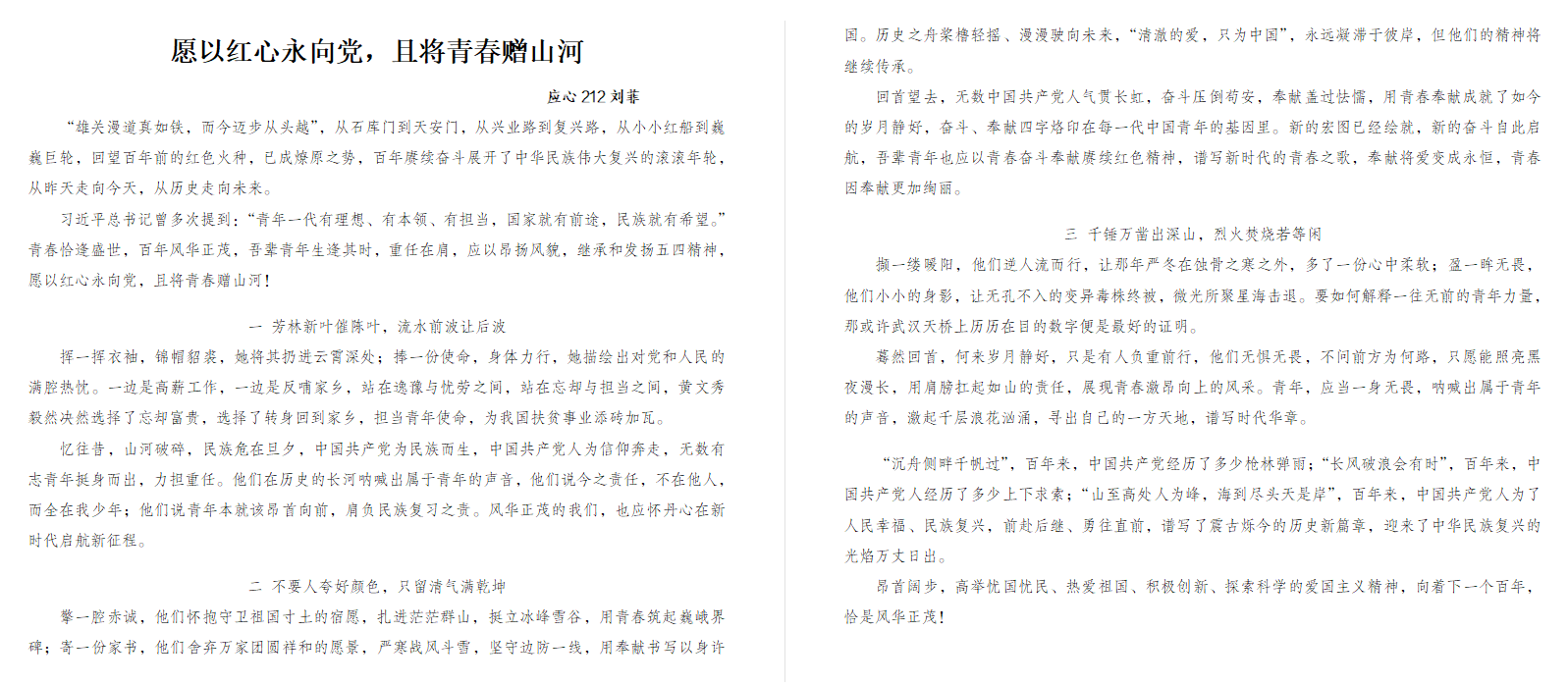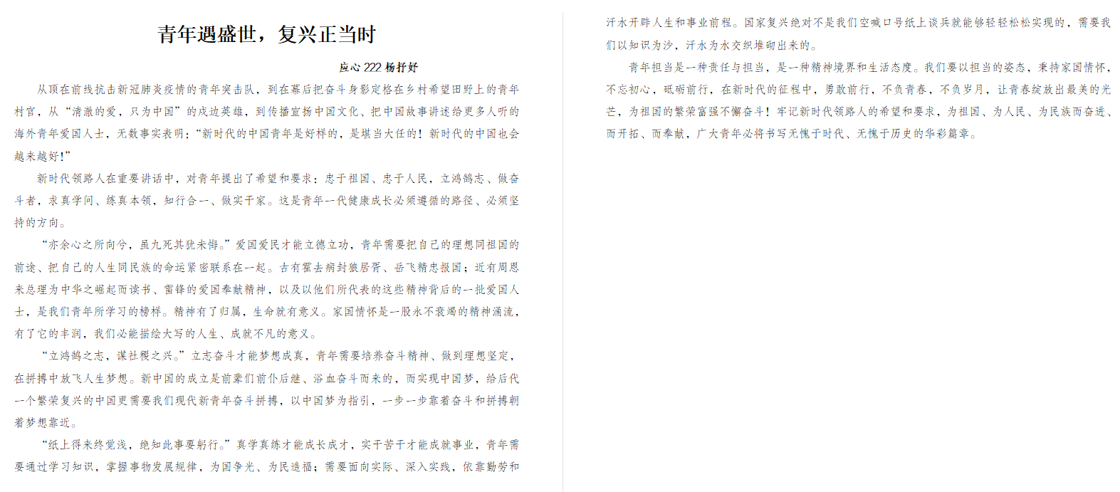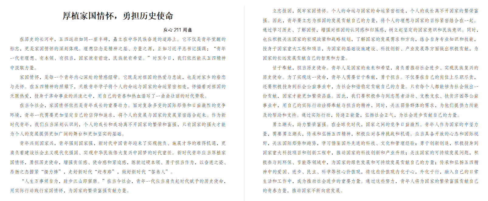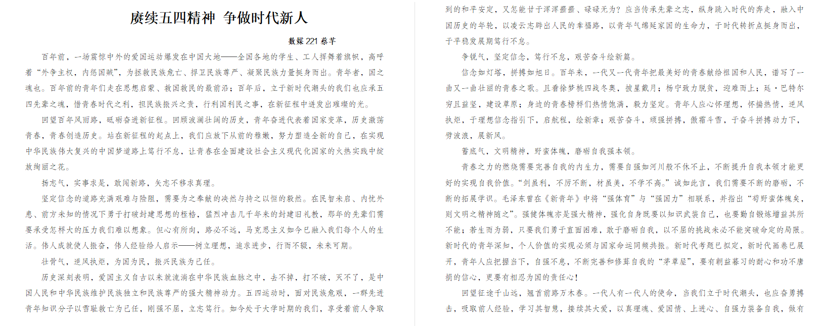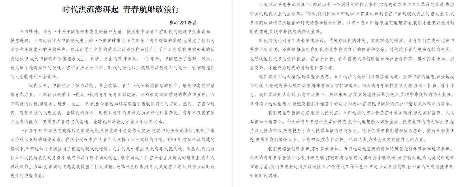 特别举办了以“赓续五四精神,担当青年使命”为主题的五四青年节征文活动。同学们纷纷拿起笔,用文字记录自己的青春故事,用热情书写对梦想的追求。经过激烈角逐,众多优秀作品脱颖而出,展现了青年学子的才华与风采。下面请欣赏部分优秀作品: