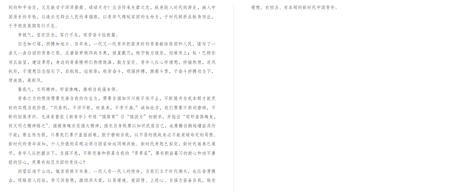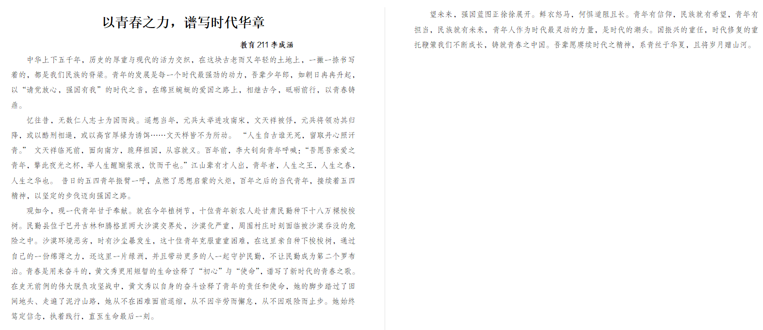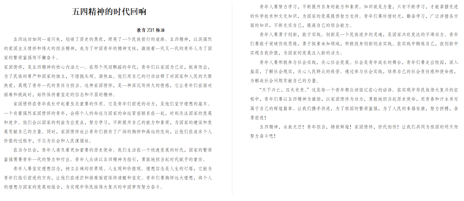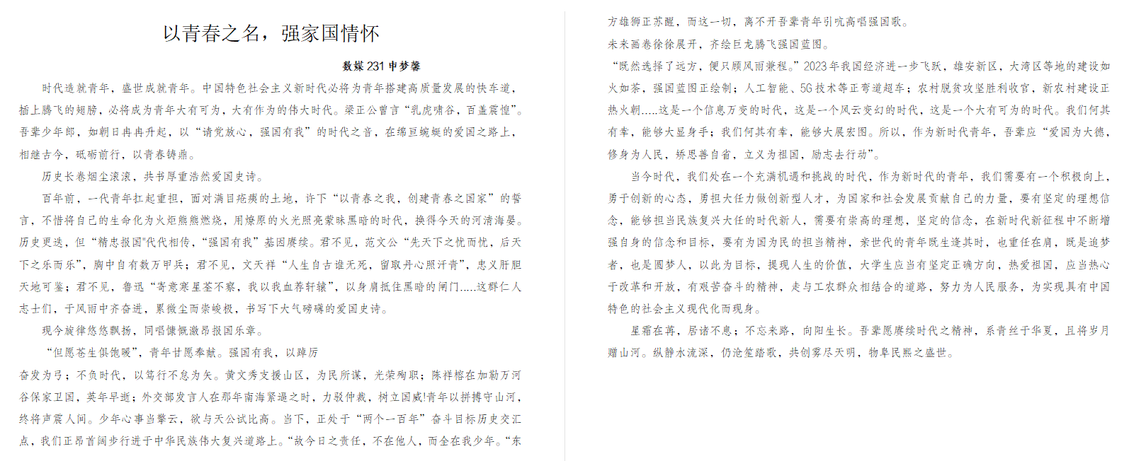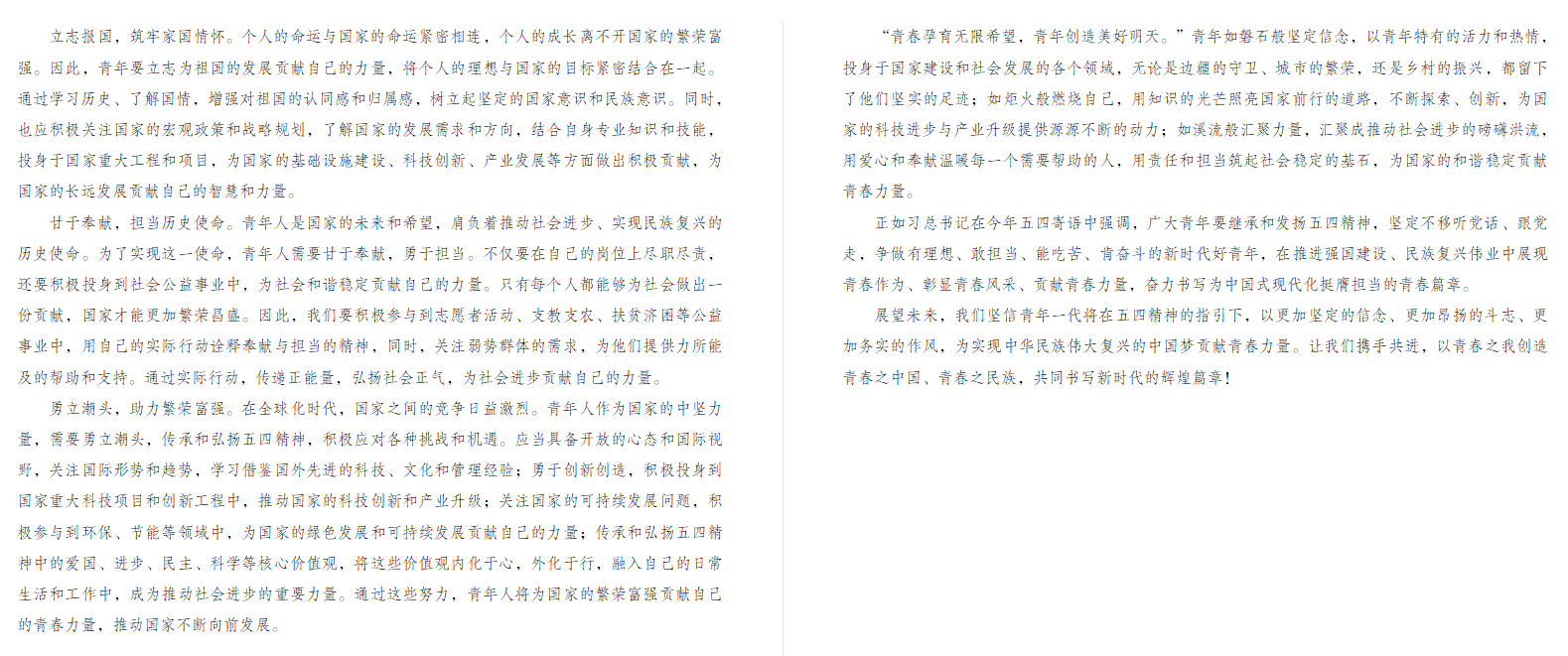 特别举办了以“赓续五四精神,担当青年使命”为主题的五四青年节征文活动。同学们纷纷拿起笔,用文字记录自己的青春故事,用热情书写对梦想的追求。经过激烈角逐,众多优秀作品脱颖而出,展现了青年学子的才华与风采。下面请欣赏部分优秀作品: