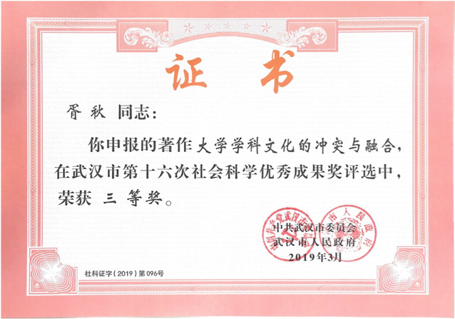 小宝影院 胥秋老师在2019年3月“武汉市第十六次社会科学优秀成果奖”评选中申报的著作《大学学科文化的冲突与融合》荣获三等奖,在此特恭喜胥秋老师,并希望小宝影院 教师再接再厉取得更多成就。