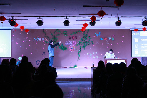 随着主持人的开场白后,渐渐拉开了晚会的帷幕。动听的民乐《把黑夜照亮》、动情的手语表演《天使》、动人的汉服舞蹈《北方有佳人》等节目描绘出一幅幅多姿多彩的年轻画卷。其中来自NAME心理学社的话剧表演《白雪公主》与DNA人力资源社的舞蹈剧《一见钟情》更是将现场的气氛推向了一个全新的高潮。话剧《白雪公主》以恶搞的方式向观众展示了不一样的童话经典,男主角们倾力的反串更是引来观众的阵阵欢笑。舞蹈剧《一见钟情》向观众讲述了一个单纯美好的校园爱情故事,使在场观