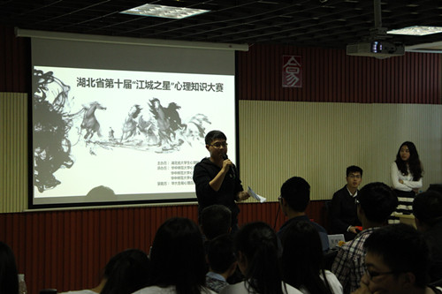 2014年5月10日,我校NAME心理学社共8人前往华师参加“探索自我,成就未来”为主题的“江城之星”心理知识竞赛。本次大赛由湖北省大学生心理健康联合会与湖北省众多高校合作,在华大合易心理应用技术有限公司会议大厅隆重举行,旨在增强高校大学生对心理健康的关注,培养团队协作、创新精神,呼吁大学生关注自己的心理健康。此次大赛共有来自全省的30所高校代表队参赛。