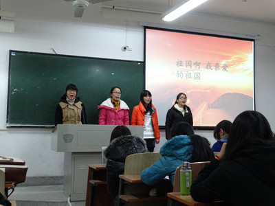 比赛中,选手们有的是朗诵爱国诗歌,有的是朗诵积极向上的理想篇章,每一组参赛选手都以一颗炙热的爱国心诵读内心对祖国最真挚的独白。《我骄傲,我是中国人》激昂高亢;《梦随华夏,情系中华》深情款款;《青春万岁》润泽身心。其中教育学班范青青同学的那一句“我骄傲,我是中国人”所饱含的激情和深沉的热爱感染着在场的每一位同学。而刘念平、胡博文、明星辰所带来的《雪花飘进1935》为我们讲述了79年前今天的状况,将比赛推向高潮。她们用自己真切的呼声和满含沉痛的呐喊激励着今天的我们,提醒着我们——勿忘国耻。