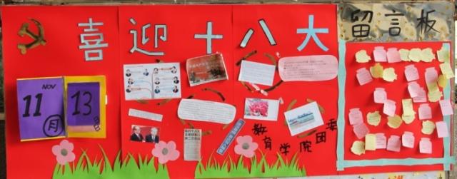 宣传板上的“喜迎十八大”专题主要分为两个部分,一个部分主要更新党的十八大召开的新闻,为向学生及时传达党的十八大召开的 最新动态,让学生了解十八大召开的内容;另一部分是寄语板块,便利贴上的文字深深的表达了小宝影院