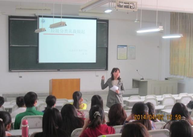报告会上,贺念老师主要从垃圾分类的意义、垃圾的种类、垃圾的循环利用、垃圾分类的注意事项、国外垃圾分类的借鉴五个方面进行专题讲授。首先由各种触目惊心的照片引出垃圾分类的意义。并结合生活中的事例,摆出具体数据给学生以直观的感受。她强调,要做到垃圾分类首先要明确垃圾的种类,紧接着又为同学讲解了垃圾的循环利用的主要原则,即3R原则--减量化原则、再使用原则、再循环原则。