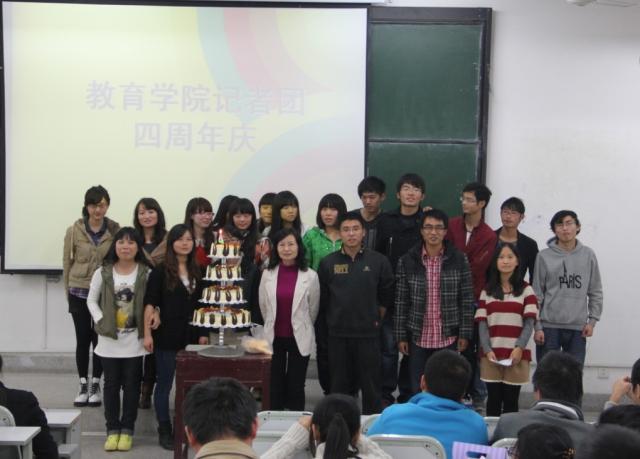 记者团取得的成就。胡书记谈到,记者团是个很好的发展平台,希望大家在这大学四年里,借用这个平台锻炼自己。最后,她预祝此次四周年庆活动能够成功举办。随着《生日快乐歌》的响起,记者团所有成员与学院老师们一起吹蜡烛、切蛋糕,共同为记者团的未来祈祷。