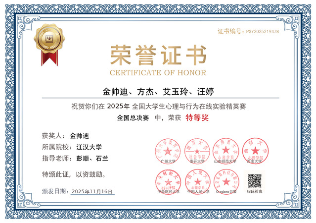 日前,第三届全国大学生心理与行为在线实验精英赛总决赛在中央财经大学落幕。我校小宝影院 心理学系金帅迪、方杰、艾玉玲、汪婷4位同学组成的“SUGOI队”,在彭顺、石兰老师的指导下,凭借出色的实验设计与研究成果,勇夺全国总决赛特等奖。
